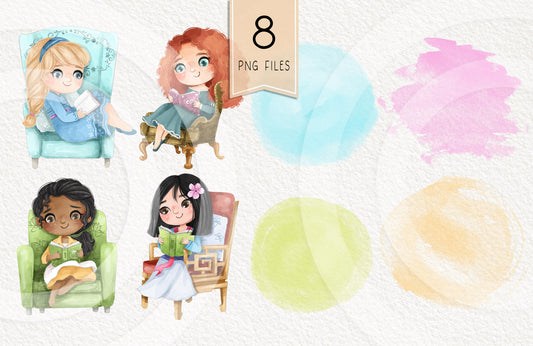Cute Princess reading book clipart set 1, PNG set 1,PNG files 300 dpi.