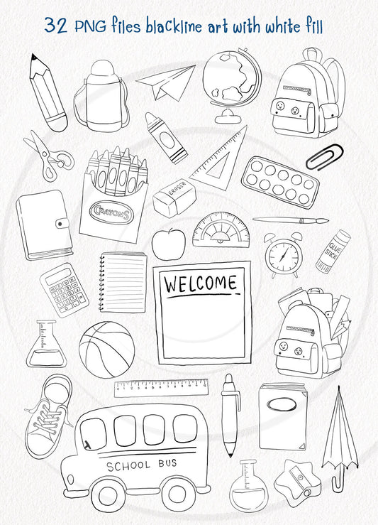 Back to School digital stamp Clipart, digital stamp clipart, blackline art instant download PNG file - 300 dpi