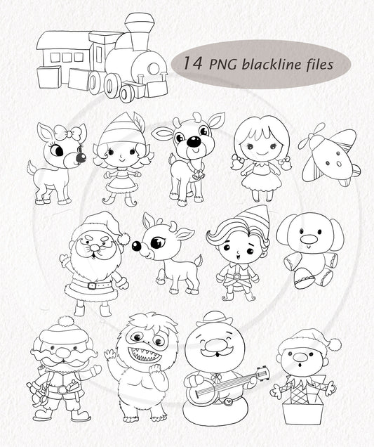Cute Reindeer and friends ,Blackline art, digital stamp clipart PNG files 300 dpi.