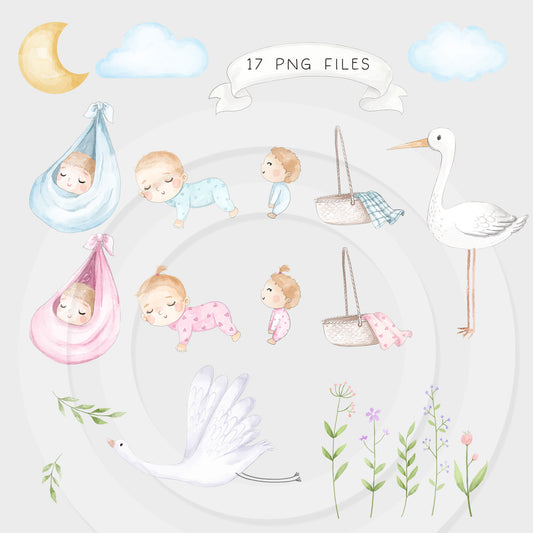 Welcome Baby Watercolor Clipart , Stork baby shower clipart PNG files.
