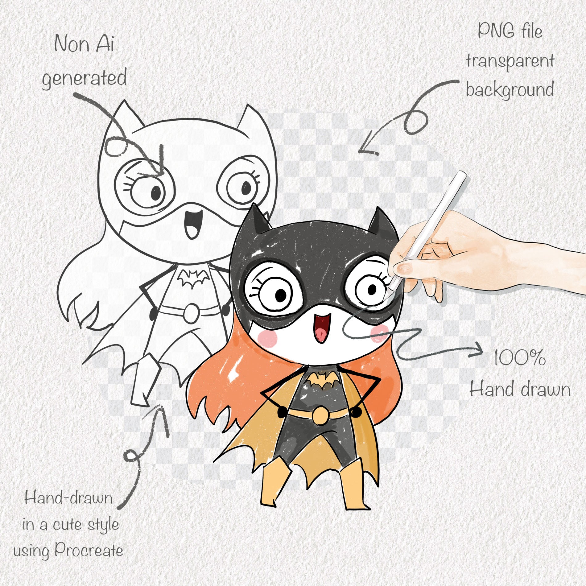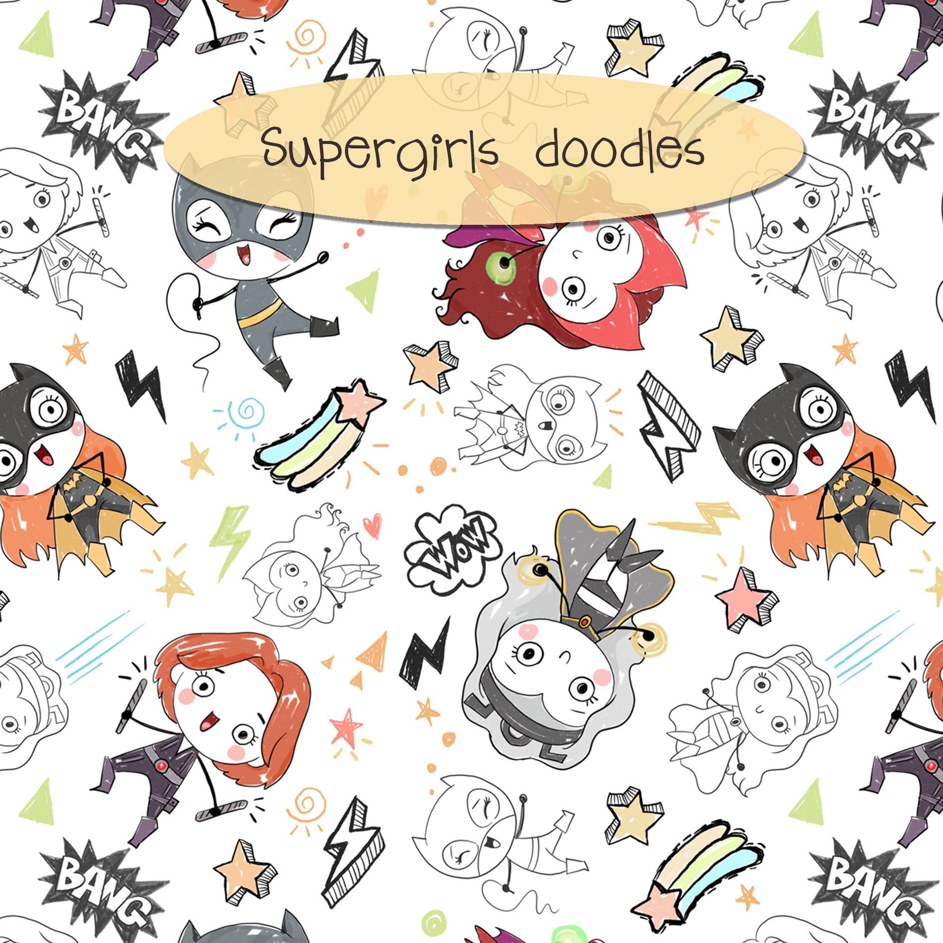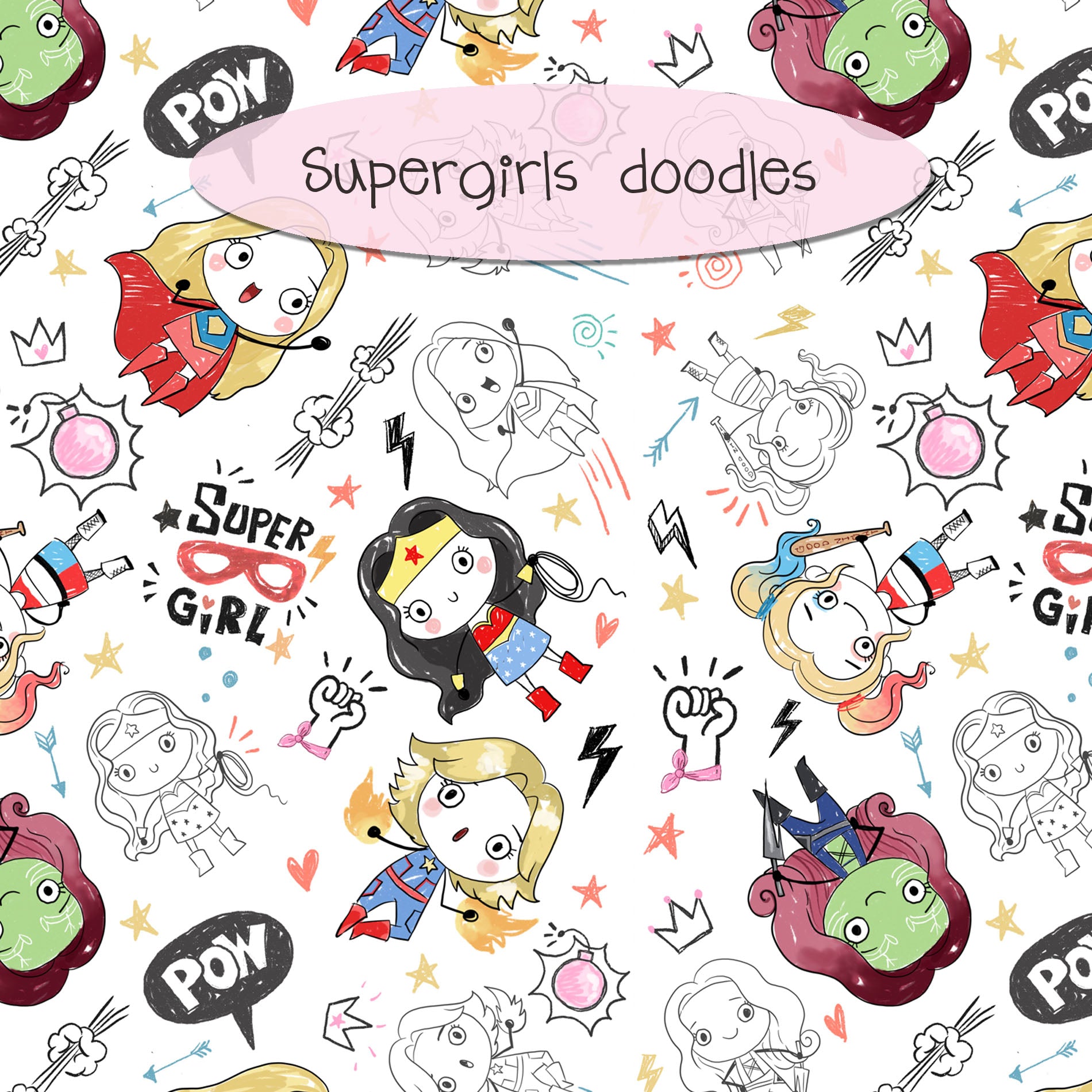 Super girls Hand Drawn ,doodle clipart, Seamless Pattern, instant download PNG file - 300 dpi